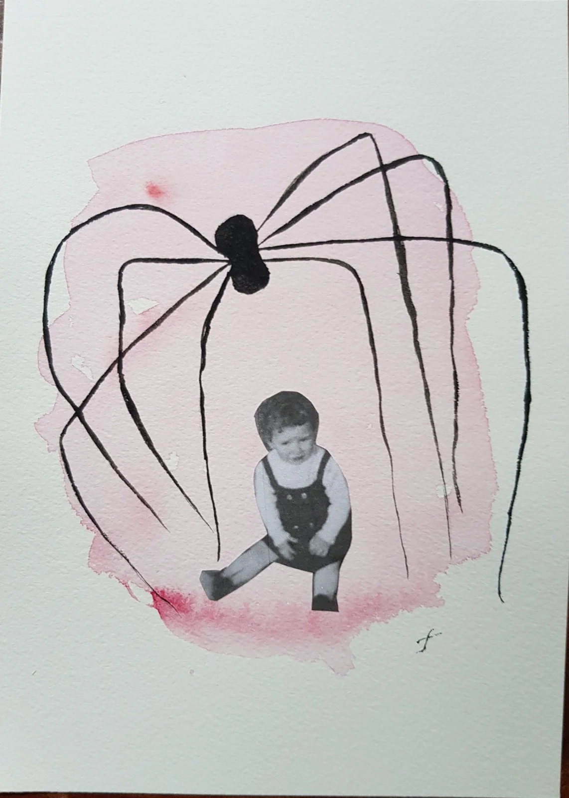 In this collage, the huge spider, inspired by Louise Bourgeois’ art, is protecting my very young self. Creating this composition showed where my harshness was coming from and allowed me to forgive myself and repair the damage my fear had created.